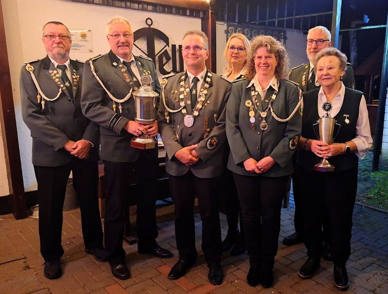 vlnr.: Schießsportleiter Klaus Hettwer, Pokalsieger Thomas Blecker, Vereinskönig Uwe Lehmann, Vereinskönigin Sonja Lohmann-Steyding, 1. Vorsitzender Dieter Gehler, Pokalsiegerin Gisela Hettwer.
